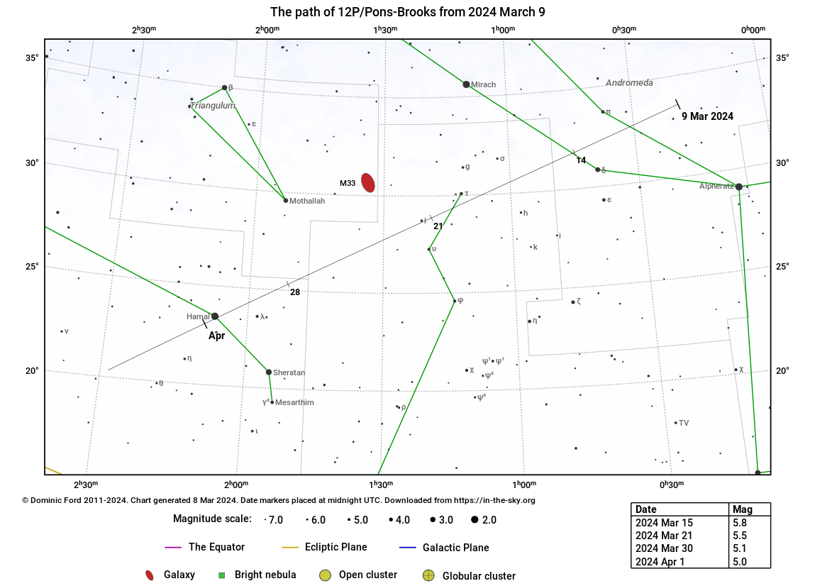 Ezen a két estén a δ And csillagtól 1,5 fokra észak, illetve 1,3 fokra északkelet felé lesz látható az üstökös. A δ And egy 3,3 magnitúdós, szabad szemmel is könnyen észrevehető csillag, így nagyban segíti az üstökös megtalálását akár szabad szemmel vagy távcsőben nézzük.