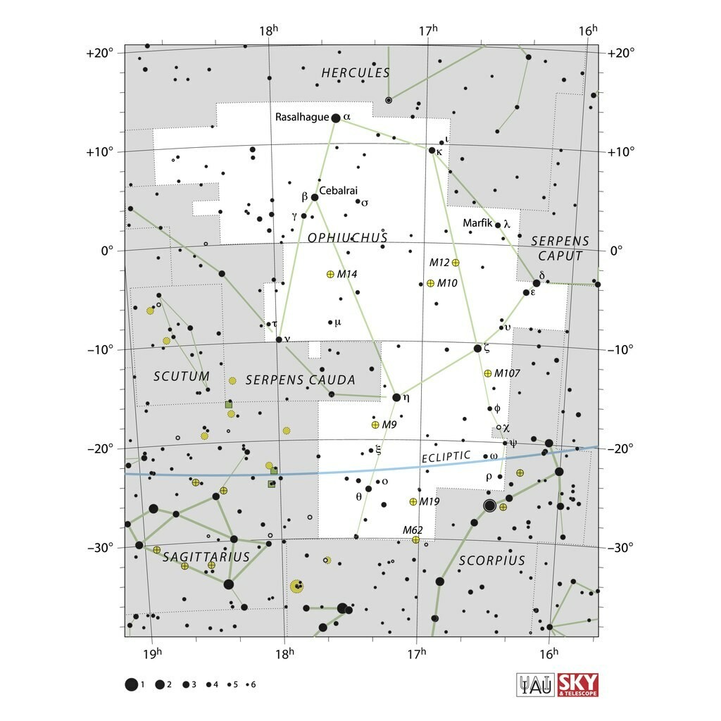 - Messier 12: gömbhalmaz, a Földtől 23.000 fényévre. Fényessége 7,7 magnitúdó. Az M12-ben a vártnál kevesebb kis tömegű csillag található. A csillagászok azt gyanítják, hogy a gravitáció sok kis tömegű csillagot kiszakított belőle, amikor a halmaz a galaxis középpontja körüli pályája során áthaladt a Tejútrendszer sűrűbb régióin. Úgy gondolják, hogy az M12 így akár egymillió csillagot is elveszíthetett.