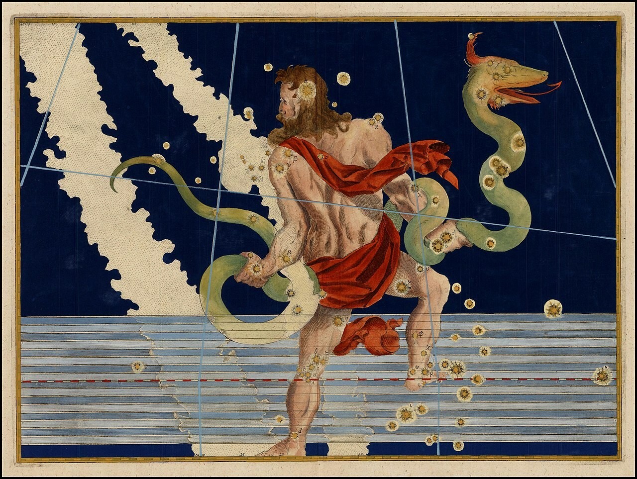 Magát az alakot később a görög monda alapján Aszklépiosszal azonosították. Halandó földi ember volt, aki Apollón és a thesszáliai király lányának, Korónisznak szerelméből fogant. A hölgy, amikor már gyermeküket szíve alatt hordta, szerelmes lett Iszküszbe, Elatosz fiába. Miután Apollón megtudta a titkos kapcsolatot, a féltékeny isten arra kérte Artemiszt, hogy nyilával ölje meg Koróniszt. Apollón a halotti máglyán vágta ki anyja hasából Aszklépioszt, majd a kentaurok egyikére, Kheirónra bízta nevelését. Tőle tanulta meg a gyógyítás mesterségét, majd idővel minden betegséget meg tudott gyógyítani, még a halottakat is képes volt feltámasztani. Ez probléma volt, hiszen senki nem halt meg, ezért Thanatosz, a halál istene bepanaszolta őt Zeusznál. A főisten, hogy a világ rendjét ne zavarhassák tovább, villámával halálra sújtotta Aszklépioszt. Apollón kedvéért alakját a csillagok közé, az égre emelte. Ott látható mellette a kígyó is, amely segítette őt a gyógyításban.