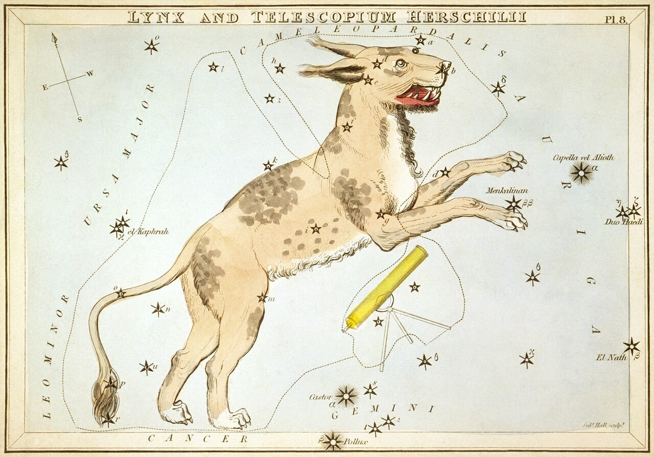 Érdekesség, hogy a csillagkép néhány csillagát a 18. században egy ma már nem létező csillagképbe, a Telescopium Herschelii nevű formációba foglalták bele. Ezt a konstellációt Hell Miksa vezette be annak tiszteletére, hogy William Herschel 1789-ben felfedezéste az Uránusz bolygót. Eredetileg két csillagképet foglalt magában: a Tubus Herschelii Major-t az Ikrekben, a Hiúzban és az Aurigában, valamint a Tubus Herschelii Minor-t az Orionban és a Bikában; mindkettő Herschel távcsöveit ábrázolta. Johann Bode 1801-ben Telescopium Herschelii néven egyesítette Hell csillagképeit, amelyek főként a jelenlegi Aurigában helyezkedtek el. Később néhány égi térképész figyelmen kívül hagyta, de az 1890-es években két műben mégis megjelent. Pritchard Allen azonban 1899-ben megjegyezte, hogy kezd elavulttá válni. Az 1920-as években, amikor a Nemzetközi Csillagászati Unió meghatározta a csillagképek hivatalos határait, csillagai beolvadtak az Auriga, az Ikrek és a Hiúz csillagképbe.