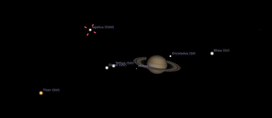 A bolygó keleti oldalán, meglehetősen távol (kicsit több mint egy teljes gyűrűszélességre) lesz a Iapetus a fogyatkozás idején a gyűrűtől. A legfényesebb szaturnuszhold, a Titan a bolygónak szintén a keleti oldalán, azonban délebbre lesz ekkor éppen – tájékozódási pontnak ez remek, így pontosabban tudjuk majd, hogy merre kell keresni a Iapetust, amikor várjuk a felbukkanását.