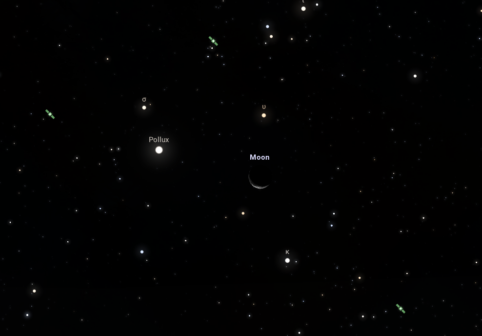Ezen a napon a Hold sarlója mindössze 15%-os lesz, amint C-betűjével szerényen végighalad szemünk előtt az égen. Hajnali 4 órakor érkezik meg 2 fokkal a Pollux mellé, s szintén a közelségében lesz, mégpedig tőle 1 fokos távolságban egy szabad szemmel is látható, 4,1 magnitúdós látszó fényességű csillag, az Ikrek csillagkép Üpszilon Gem nevezetű csillaga. Ekkor a Hold 20 fokkal a keleti horizont felett tartózkodik majd, így lényegesen könnyebben megfigyelhetjük, mint például a hónap elején vagy akár a következő napon. Ezúttal aki felnéz az égboltra, talán előbb találja meg a fényes Pollux csillagot, és csak később a Hold sarlóját, ugyanis minél vékonyabb égi kísérőnk alakja, annál nehezebben vesszük észre annak ellenére is, hogy látszó átmérőjét tekintve bőven meghaladja a csillagok méretét. Ha tehát megtaláltuk az Ikrek csillagképet, és abban is a Pollux csillagot, attól egy kicsit lefelé, jobbra megleljük keresett C-alakzatunkat. A Hold sarlóját nem csak szabad szemmel, hanem távcsővel is érdemes megfigyelni.