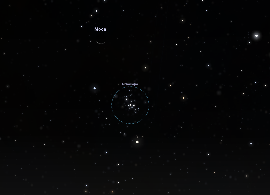 A nyár utolsó napja szintén szépséges együttállással gyönyörködtet meg bennünket hajnali 4:30-kor. Ebben az időpontban talán már ébren vannak azok, akiknek általában korán kell dolgozni járniuk, így ha véletlenül ezen a napon is felébrednek a szokott időpontban, ne felejtsék el megkeresni a Hold sarlóját. Ekkorra az égi kísérő C betűje 8%-osra csökken, az előző naphoz képest pedig jóval közelebb lesz a keleti horizonthoz, mindössze 15 fokos magasságban. Megkeresése ezért még nagyobb kihívást rejt magában, mint a Polluxszal történő együttállásakor. Augusztus 31-én nem csillaggal, hanem nyílthalmazzal áll együtt Holdunk, mégpedig a Jászol-halmaz néven is ismert, M44-es katalógusszámú Messier-objektummal. A csillagászok számára Praesepe néven ismert halmaz a Hold alatt, kicsit jobbra látható majd. A két nevezett égi objektum egymástól 3,3 fokos távolságban lesz, így ha az egyiket sikerült megtalálnunk, a másik is könnyedén sikerülni fog. A Jászol-halmaz a Plejádokhoz hasonlóan szabad szemes, azonban annál sokkal nehezebben vehető észre 4,5 magnitúdós látszó fényességével. Éppen ezért érdemes távcsövet is magunkkal vinnünk nem csak a holdsarló, hanem a nyílthalmaz megfigyelése miatt is.