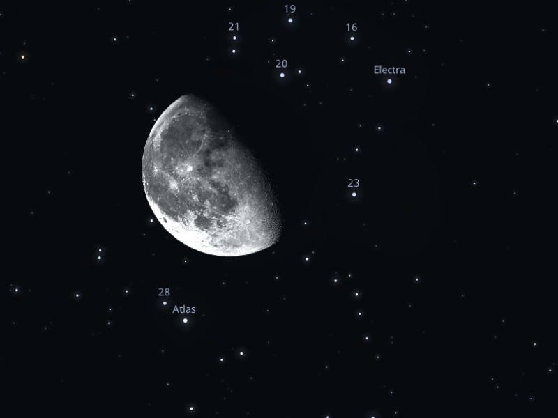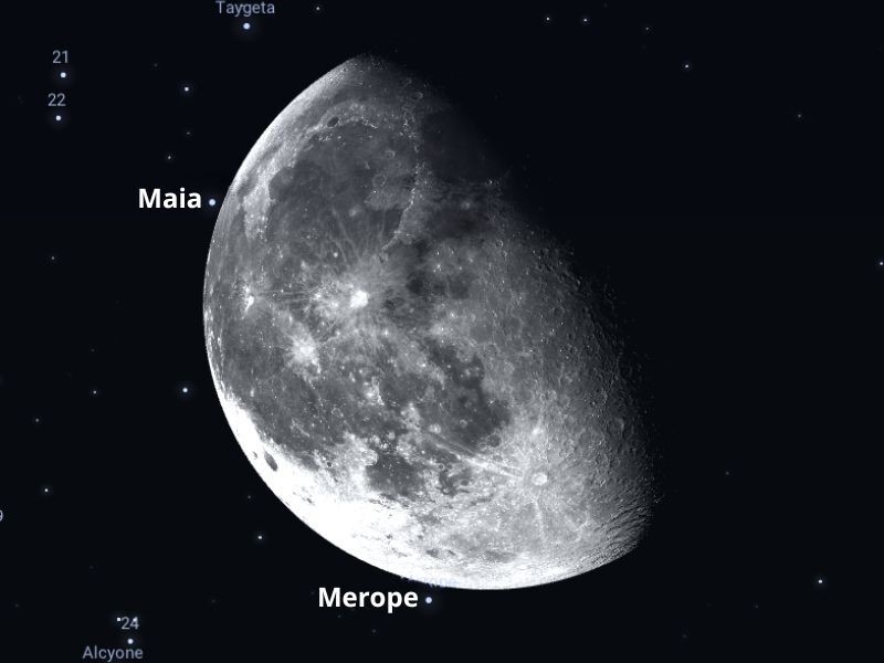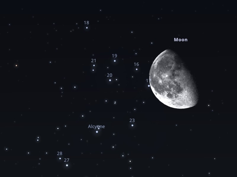 A következő jelenség egy izgalmas és ritka kettős csillagfedés lesz. 22:36-kor a 3,9 magnitúdós Maia (20 Tau) a Hold északi részén, majd 1 perc múlva égi kísérőnk déli részén a 4,1 magnitúdós Merope (23 Tau) tűnik el a Hold mögött. A kilépésük viszont nem egyszerre fog megtörténni, a 20 Tau 23:13-kor a Hold északi, a 23 Tau 23:03-kor déli részén fog feltűnni újra az égbolton. A legfényesebb csillagfedésre 22:59-kor kerül sor, amikor a 2,9 magnitúdós Alcyone belép a fényes holdkorong mögé égi kísérőnk déli részén, és 23:39-kor szintén a déli részen előbukkan.