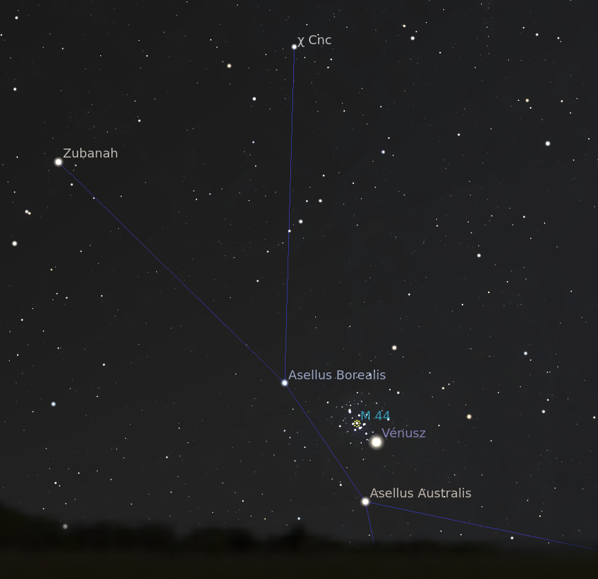 Méltó módon köszönhetünk el a Vénusztól a mostani együttállással – augusztus 18-án hajnalban áthalad a két csacsi (Asellus Borealis és Australis) által közrefogott Praesepe, avagy Jászol (vagy Méhkas) halmazon. A bolygó a halmaz középpontjától 38 ívpercre dél felé, a csoportosulás peremén halad át.