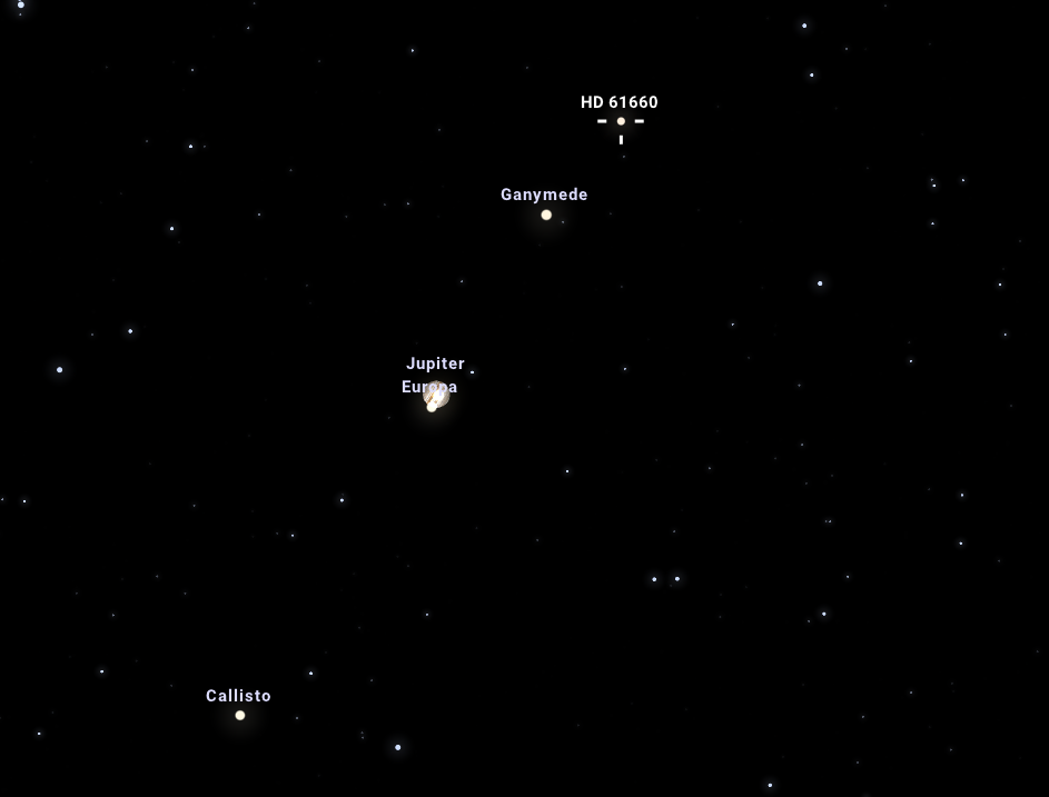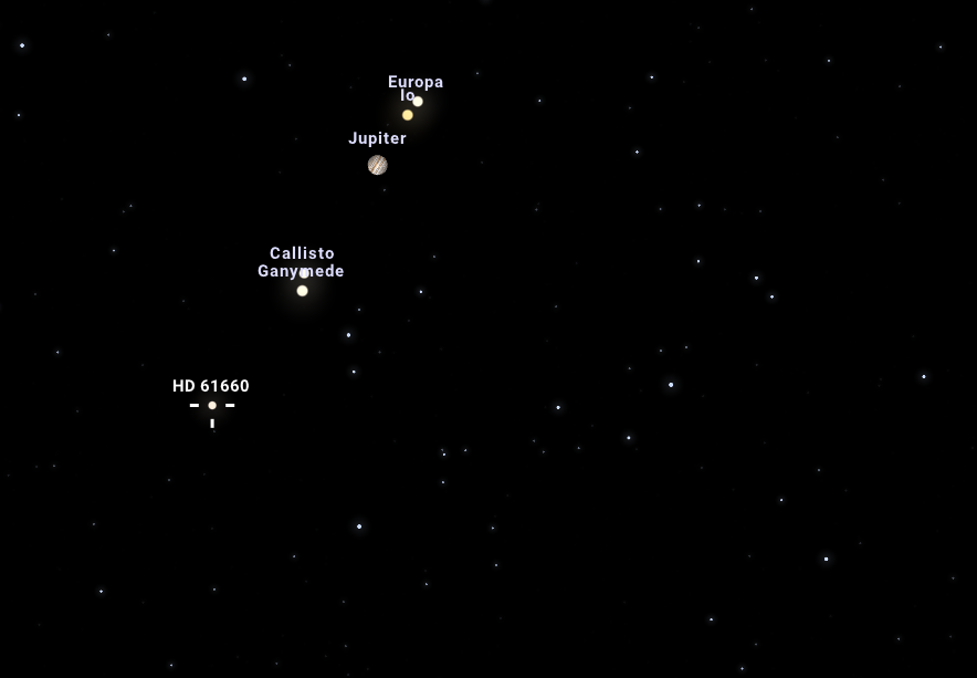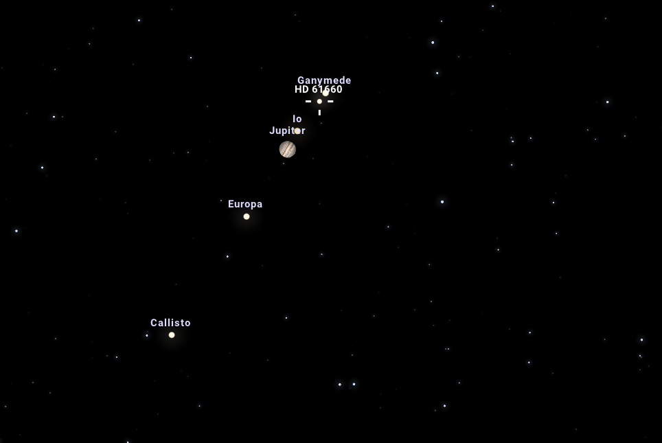 A hónap 12. és 15. napja között ugyanis egy 7,9 magnitúdós csillag, a HD 61660 a Jupiter holdjainak síkjába ér, és távcsővel megfigyelve egy egyenest alkot a jól ismert Galilei-holdakkal, amelyeket Io, Europa, Callisto és Ganymedes néven ismerünk. A bolygók királyát az éjszaka második felében figyelhetjük meg az égen, így ezúttal azok vannak előnyben, akik szeretnek éjszakázni. Ezt a jelenséget ugyanis semmiképpen sem érdemes kihagyni, és tekintve, hogy napokon át is igazán látványos lesz, remélhetőleg még az sem veszi el a lehetőséget az észleléstől, hogy egy-egy éjszaka borult lesz az ég.
