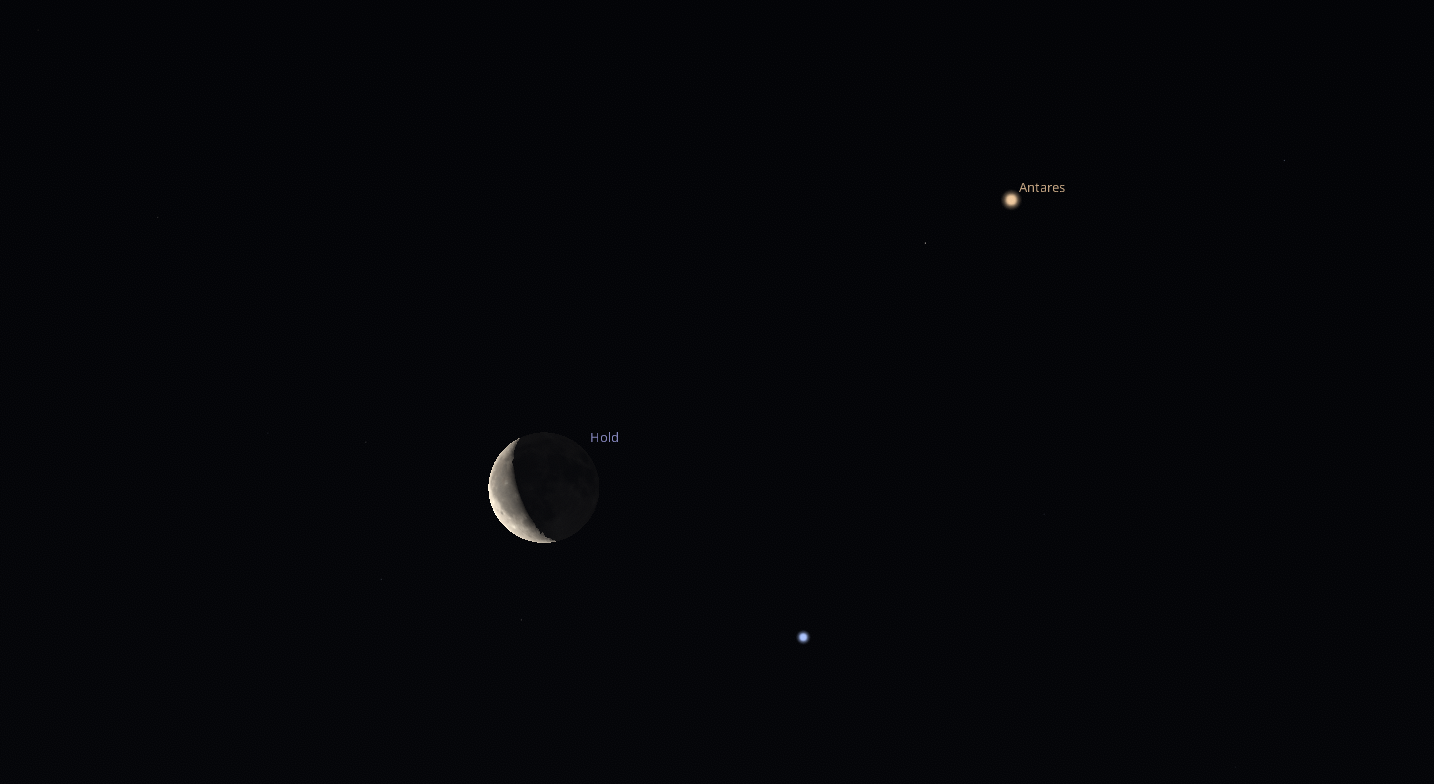 Február 5-én reggel 6 órakor az Antares és a 28%-os holdsarló együttállásában gyönyörködhetünk majd. A déli égbolton, a horizont felett mindössze 12 fokkal lesz megfigyelhető a páros, így erősen ajánlott egy viszonylag magasabban fekvő hely kiválasztása, az emeletes házak tengerének alső szintjeiről való észlelésre nem sok az esély.
