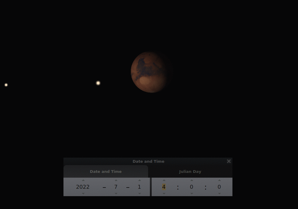 A Mars látszó szögméretének változása a 2022-23-as láthatóság során. A szimuláció félhavi felbontással készült, alul követhető az aktuális dátum. Távcsőbe pillantva nem láthatunk ilyen részleteket a bolygón, a mozgókép csak a Mars látszó méretének radikális változását hivatott bemutatni.