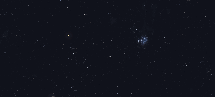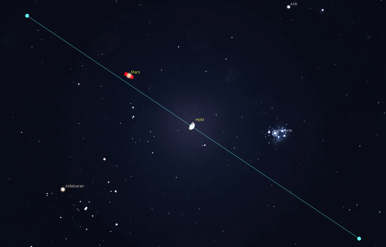 Jelenleg a Mars a Fiastyúk természetes élőhelyén, azaz a Bika csillagképben jár. A még közelinek mondható 10 fok távolságra látszanak egymástól, ami körülbelül hússzorosa a fél fok átmérőnyi telihold átmérőjének. Külső bolygószomszédunk előretartó mozgást végez, minden nap közel 30 ívmásodpercet távolodva a nyílthalmaztól.