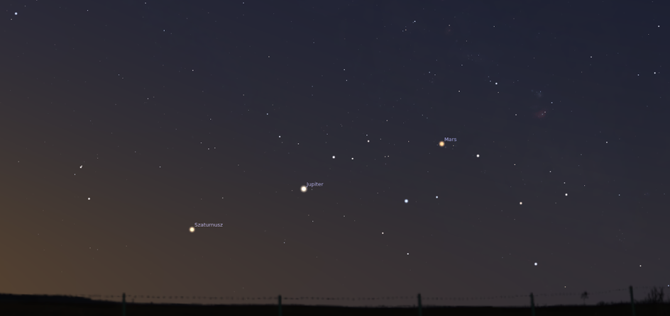 Február végén a horizonthoz legközelebb a halvány sárgás Szaturnusz helyezkedik majd el, őt követi a három égitest közül legfényesebb, a világos fehér Jupiter. Végül legmagasabban a vörös színben tetsző, halványabb Mars látszik majd.