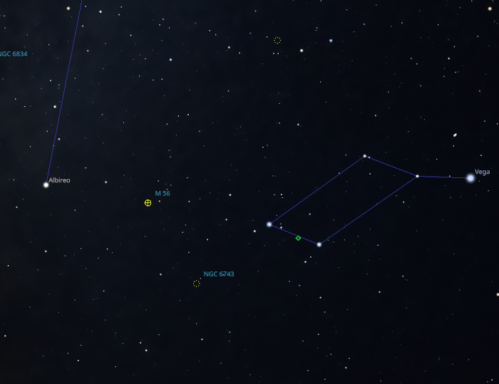 A Messier 56 a Lant csillagképben található, így Magyarországról is könnyen elérhető célpont. Tavasztól őszig érdemes keresni az esti égbolton. Szabad szemmel nem látható, és kisebb távcsövekkel sem túl feltűnő: inkább halvány 7’-es látszó átmérőjű foltnak tűnik. Maga Charles Messier francia csillagász is, amikor 1779-ben felfedezte, ködös objektumnak írta le, csillagokra bontani még nem tudta. Közepes, legalább 20 cm-es vagy nagyobb amatőrtávcsövekkel azonban már előtűnnek a részletek, és csillagokra bontható. Bár nem olyan látványos, mint például a Herkules-halmaz (M13), fényesség 8,8 magnitúdó körüli, mégis különleges élmény a saját szemünkkel megpillantani egy olyan objektumot, ami alig fiatalabb az Univerzumnál.