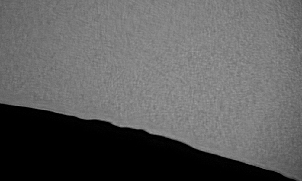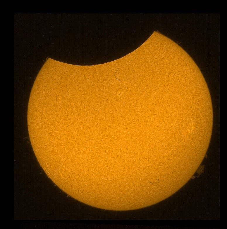 Békési Zoltán a 2015. március 20-ai fogyatkozás során nem szerénykedett a nagyítással – eredményképp látható, ahogy a Hold rücskös domborzata elvonul a Nap granulás felszíne előtt! Forrás: www.eszlelesek.mcse.hu