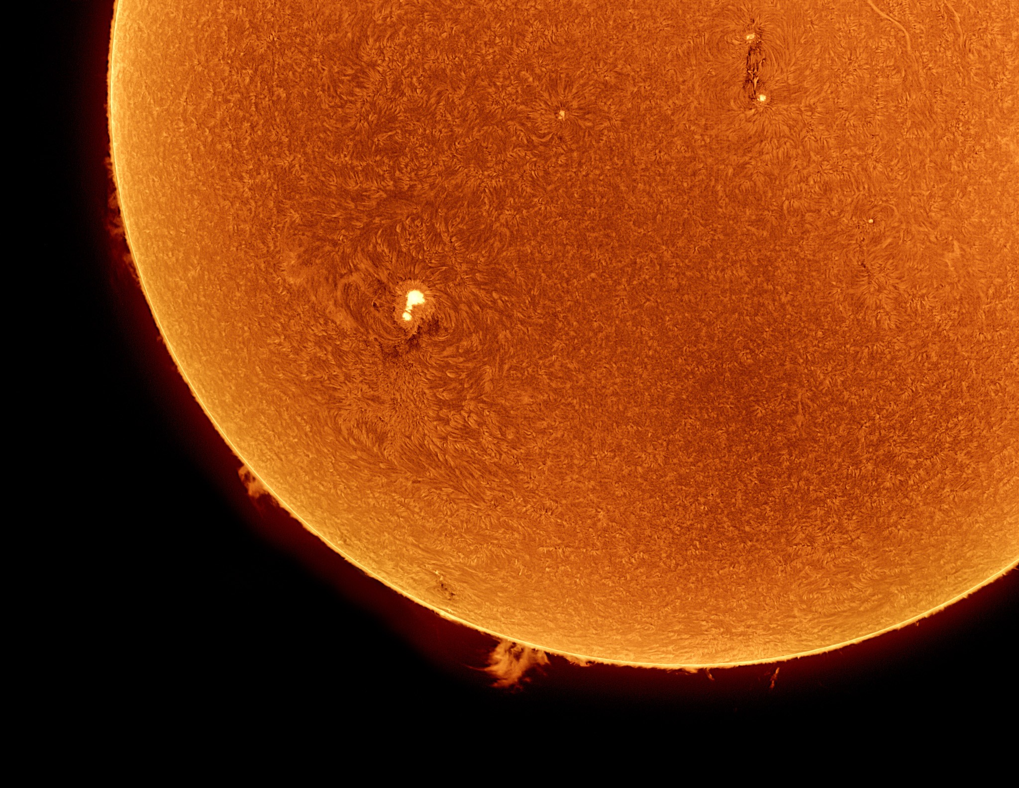 Észlelési listánk első helyén nem meglepő módon központi csillagunk, a Nap áll, ő lesz az, akit elsősorban megfigyelhetünk a világos órákban. Itt fontos felhívnom a figyelmet ara, hogy a Nap kizárólag az erre alkalmas szűrővel megfigyelhető, egyéb esetben maradandó látáskárosulást okoz! A legelterjedtebben a napfóliák vagy az ún. Herchel-prizmák, melyeknek célja, hogy a Nap fényét olyannyira lecsökkentsék, hogy biztonságosan megfigyelhetővé válnak távcsövön keresztül a napfoltok és napfoltcsoportok. Viszont a Napon sok más, akár még látványosabb történés is megfigyelhető, ehhez viszont már egy speciálisabb távcsőre lesz szükségünk. Itt jönnek képbe a lunt távcsövek, melyek kizárólag a hidrogén-alfa tartományt engedik át, így a protuberanciák és a felszín fodrozódásai vállnak számunkra is láthatóvá, de a napfoltok is teljesen más arcukat mutatják meg ebben a sávban. A Budapest kupolában található Magyarország legnagyobb ilyen távcsöve, ami rengeteg mindent megmutat nekünk a Nap felszínén zajló történésekből. Központi csillagunk pedig egy dinamikusan változó csillag, így sosem látjuk kétszer ugyan azt a távcsőbe nézve. De mutatom is hogyan néz ki egy, az ezzel a távcsővel készült fotó:
