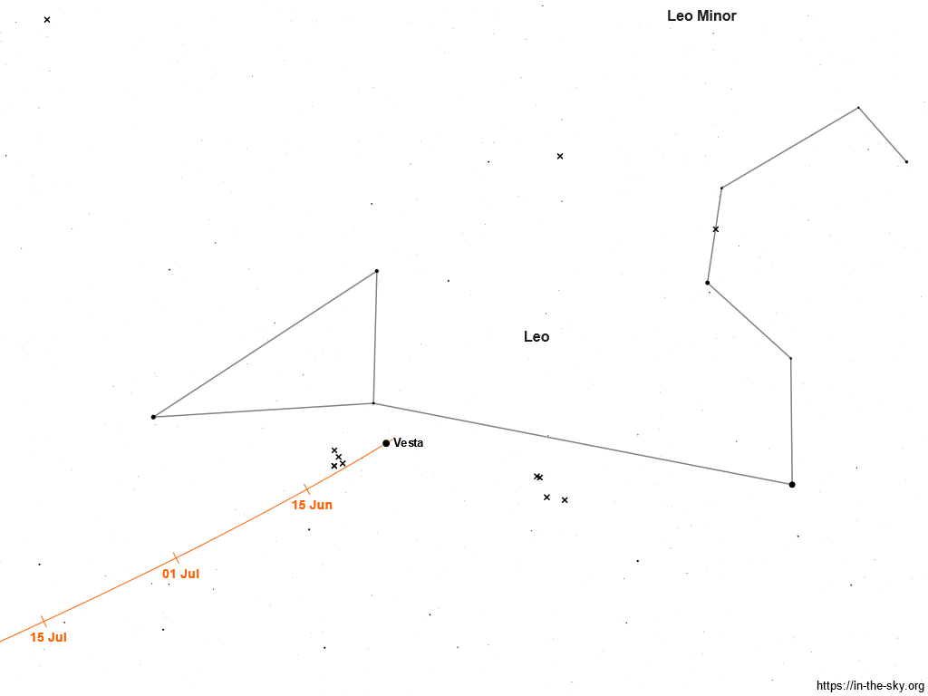 Június 7-én este 23:52 perckor a Vesta és a 73 Leonis csillag mindössze 9 ívmásodpercre lesz egymástól. Az Oroszlán csillagkép utóbbi csillaga 5,3 magnitúdós, ami azt jelenti, hogy tiszta, falusi égen szabad szemmel is látszik, de városból is már binokulárral vagy teleszkópunk keresőtávcsövével is kényelmesen megtalálható.