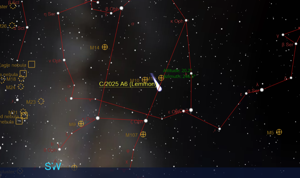 az C/2025 A6 (Lemmon) üstökös elhalad a Kígyótartó (Ophiuchus) csillagkép két fényes gömbhalmaza, az M10 és az M12 közelében. Ezen az estén 17:40 körül az üstökös nagyjából 2,3°-kal az M12 alatt helyezkedik el, 15,5° magasan a horizont felett, így a megfigyeléshez tiszta, délnyugati látóhatár és fényszennyezésmentes égbolt szükséges – bár a holdfény némileg zavarhatja a halvány részletek észlelését. A C/2025 A6 (Lemmon) viszonylag frissen felfedezett, hosszú periódusú üstökös. Pályája szerint a Naprendszer külső vidékeiről, feltehetően az Oort-felhőből érkezett és 1150 év is eltelik, mire ismét visszatér. Az üstökös fényessége ekkor 4–5 magnitúdó körül alakulhat, elvileg szabad szemmel látható, de a holdfény miatt csak várhatóan binokulárral vagy távcsővel lesz megfigyelhető.