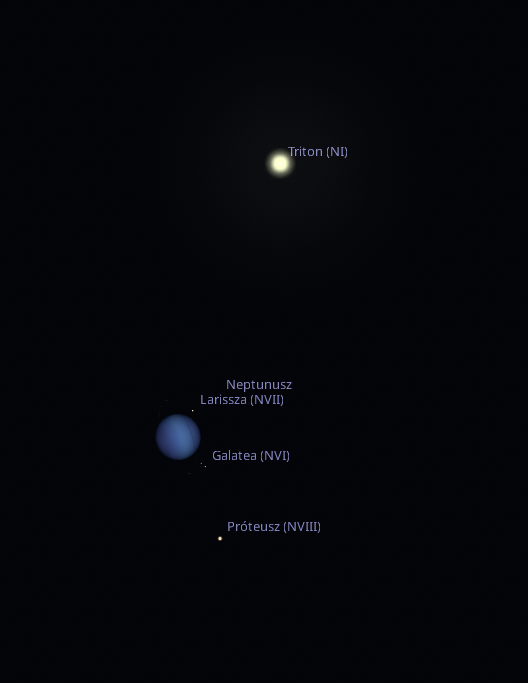 November 21-én és 22-én este a Neptunusz környékén egy apró, de rendkívül izgalmas égi együttállás figyelhető meg a távcsöves megfigyelők számára. A Naprendszer legtávolabbi bolygója mellé társul egy 13,4 magnitúdós csillag – a Gaia DR3 2449496230607588352 jelű objektum –, amely szinte megtévesztésig hasonló fényességű, mint a Triton, a Neptunusz legnagyobb holdja (13,5 magnitúdó). A két halvány pont alig néhány ívmásodpercre látszik egymástól: a csillag mindössze 16”, Triton pedig 13” távolságra helyezkedik el a Neptunusz korongjától, ráadásul derékszöget zárnak be egymással. A bolygó ekkor 32° magasan áll az égen, így a megfigyelésre ideálisak a körülmények a késő esti órákban, 22:00 körül. Ez a ritka geometriai elrendeződés különösen érdekes, mert a két objektum szinte „kettős Triton” benyomását kelti, mintha a Neptunusznak két holdja lenne ugyanazon az oldalon. A távcsőben a Neptunusz kékes korongja mellett két apró, hasonló fényességű pont ragyog, amelyek egy látványos derékszögű alakzatot rajzolnak ki.