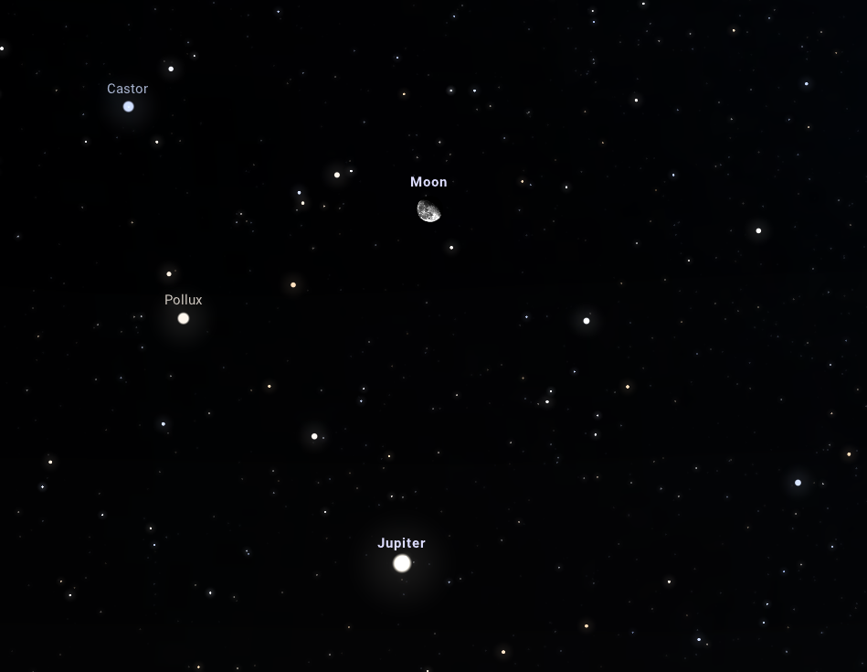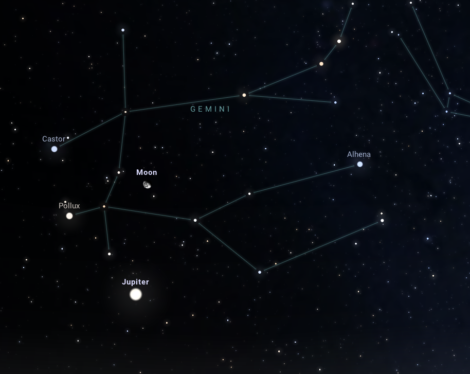 Ezen a napon este 10 órakor ugyanis a Hold megérkezik az Ikrek csillagkép legfényesebb csillagai, a Pollux és a Castor társaságába, s ha mindez még nem lenne elég, negyedikként csatlakozik hozzájuk a bolygók királya, a fényes Jupiter. Az együttállás nem igényel különösebb észlelési tapasztalatot, a Hold megkeresése után csak a hozzá legközelebbi és legfényesebb égitesteket kell észrevenni ahhoz, hogy szép élményhez jussunk.
