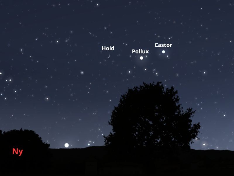 Május 30-án, pénteken 22:00-kor a nyugati égbolt felé kell tekintenünk, ahol megcsodálhatjuk a hármas együttállást. A horizont fölött 20 fokkal azonnal szembetűnik a vékony, 18%-os holdsarló. Égi kísérőnktől jobbra két fényes, szabad szemmel is jól látható csillagot pillanthatunk meg. A Holdhoz közelebbi csillag a Pollux, a távolabbi a Castor nevű, az előbbi a legfényesebb, míg az utóbbi a második legfényesebb csillaga az Ikrek csillagképnek. Azonban nem csak az égi hármasfogatot érdemes megtekinteni, hanem a Hold hamuszürke fényét is. A jelenséget az okozza, hogy a Föld óceánjai és felhői visszaverik a Napról érkező fényt, ami halványan megvilágítja égi kísérőnk elvileg árnyékban levő részét.
