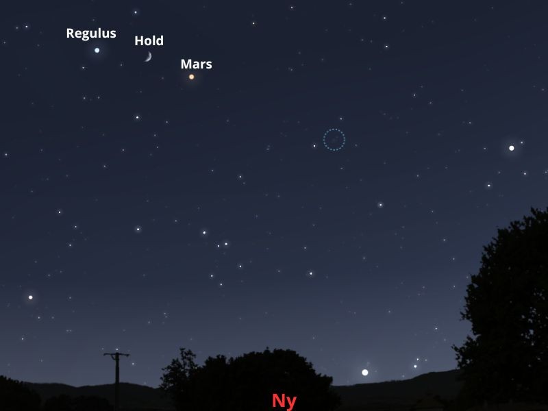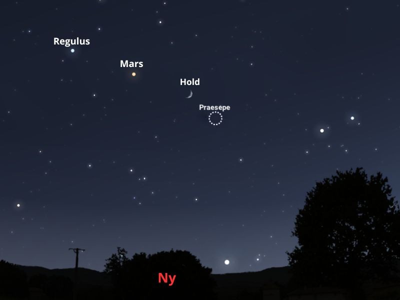 Május 30-án az Ikrek csillagkép két legfényesebb csillagával, a Castorral és Polluxszal kerül egy vonalba a vékony holdsarló. A következő estén égi kísérőnk a Méhkas-csillaghalmazzal lesz laza együttállásban és tőle balra a Mars és a Regulus csillag lesz látható. Végül a nyár első estéjén egy égi háromszöget észlelhetünk, mivel a Hold a Marssal és az Oroszlán csillagkép legfényesebb, Regulus nevű csillagával kerül együttállásba. Csillagászati távcső segítségével megtekinthetjük a Hold káprázatos krátereit is.