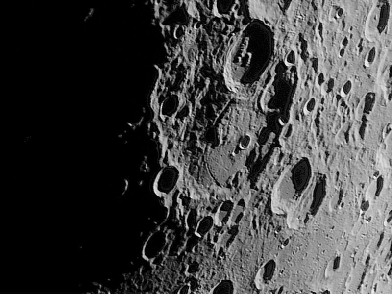 A terminátor vonala mentén haladva északról délre, fentről lefelé elsőként a Posidonius-krátert észlelhetjük. A Hold északi féltekén lévő kráter átmérője 96 kilométer, azonban nem csak méretével nyújt lenyűgöző látványt. A 3,8-3,2 milliárd éves felszíni képződmény kráterperemén belül egy kisebb, második peremet is észlelhetünk. Sőt mi több, egykor a kráter aljzata lávával volt feltöltve, amely megszilárdult és fekete bazaltot képezett a Posidonius alján, amely több helyen is megrepedezett, ezzel rianásokat hozva létre.