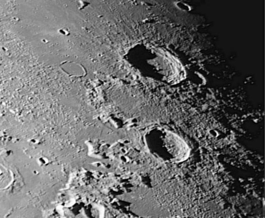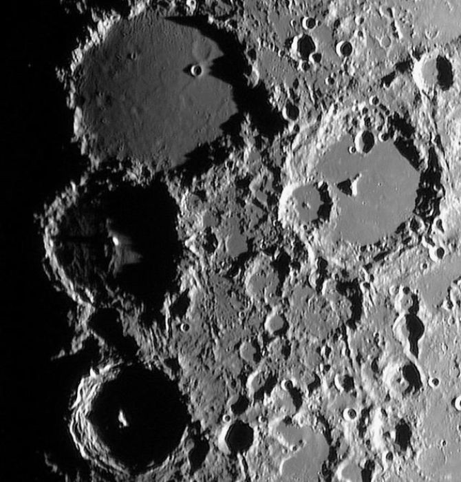 Az egyenlítőnél a Ptolemaeus, Alphonsus, Arzachel kráterhármas helyezkedik el egymás alatt. Az első a 154 km-es átmérőjével és fekete színű, bazaltos aljzatával, az Alphonsus a központi csúcsával, míg az Arzachel teraszos falával és hatalmas központi csúcsával várja az észlelők tekintetét.