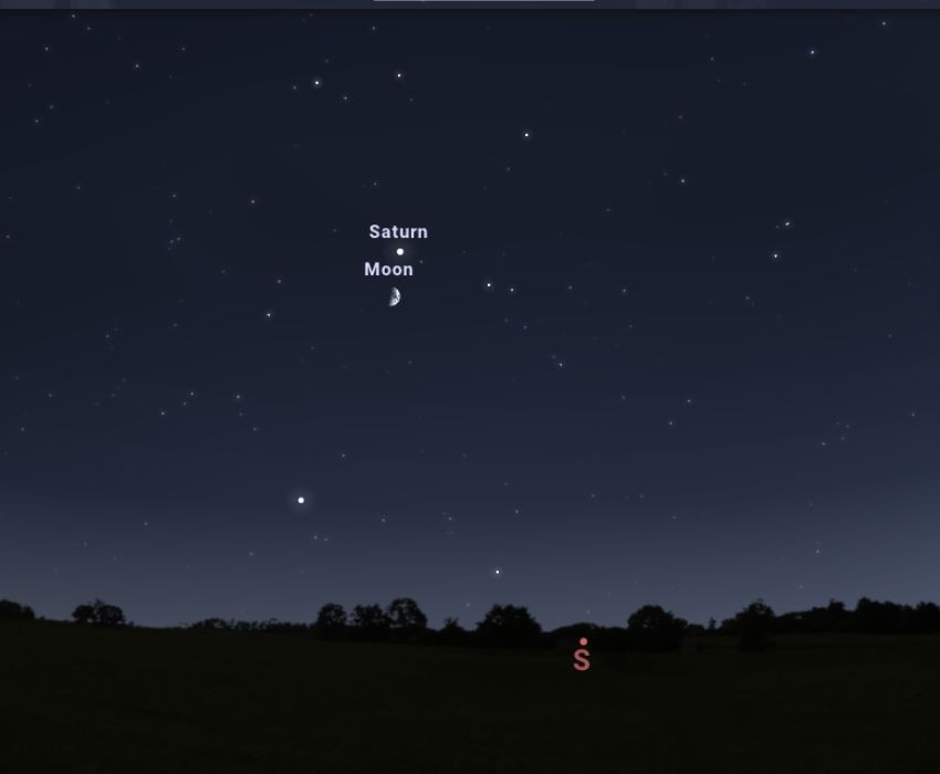 Ma este a korai sötétedésnek köszönhetően már 17:00-tól megfigyelhetjük az égi párost a déli égbolton. A Hold 25 fokos magasságban lesz, a Szaturnusz kb. 3 fokkal fölötte lesz látható. Emiatt nem mondhatjuk közelinek az együttállást, ezért távcsövünk látómezőjében nem lesz egyszerre látható mind a két objektum. Szabad szemmel a félholdat és a fölötte lévő fényes pontként megjelenő Szaturnuszt láthatjuk.