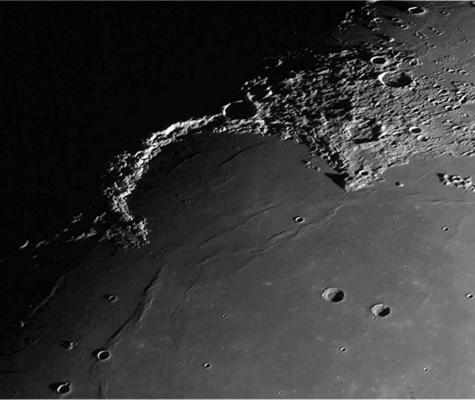 A Hold távcsöves megfigyelésének egy fontos aranyszabálya van, ami a következő. Mindig a terminátor mellett – az árnyékvonal, ami elválasztja a megvilágított és az árnyékos területeket – érdemes észlelni. Ennek köszönhetően a Hold erős fénye kevésbé bántja a szemünket, és az árnyékok játékában is gyönyörködhetünk. Égi kísérőnk északi féltekéjén azonnal szembetűnik az Esők Tengere (Mare Imbrium), amely 3,8-3,2 milliárd évvel ezelőtt jött létre egy 250 kilométer átmérőjű kisbolygó becsapódásakor. A több mint 1100 kilométer széles terület az évmilliók alatt lávával feltöltődött, majd a megszilárdulás után fekete színű bazalt jött létre. Ezzel a hihetetlen mérettel az egyik legnagyobb kráter a Naprendszerünkben. A terminátor kettévágja a Szivárvány-öblöt (Sinus Iridum), így a fölötte lévő Jura-hegység még kontrasztosabban látszik.