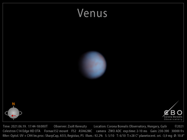 Június végén még kevesebb, mint 11 ívmásodperc átmérőjű, kicsi, 90%-os fázisú korongocskára kell számítanunk. Ez a hónapok során átfordul az ellenkezőjére - ahogy a Vénusz egyre közelebb kerül a térben a Földhöz, egyre nagyobb lesz látszó átmérője és egyre keskenyebb a fázisa. Agusztusban még mindig csak 13”-es lesz átmérője, fázisa pedig 82%-os, de októberben ez már 19”-re és 62%-ra, decemberre pedig egy vakmerő 40”-re és 28%-ra változik.