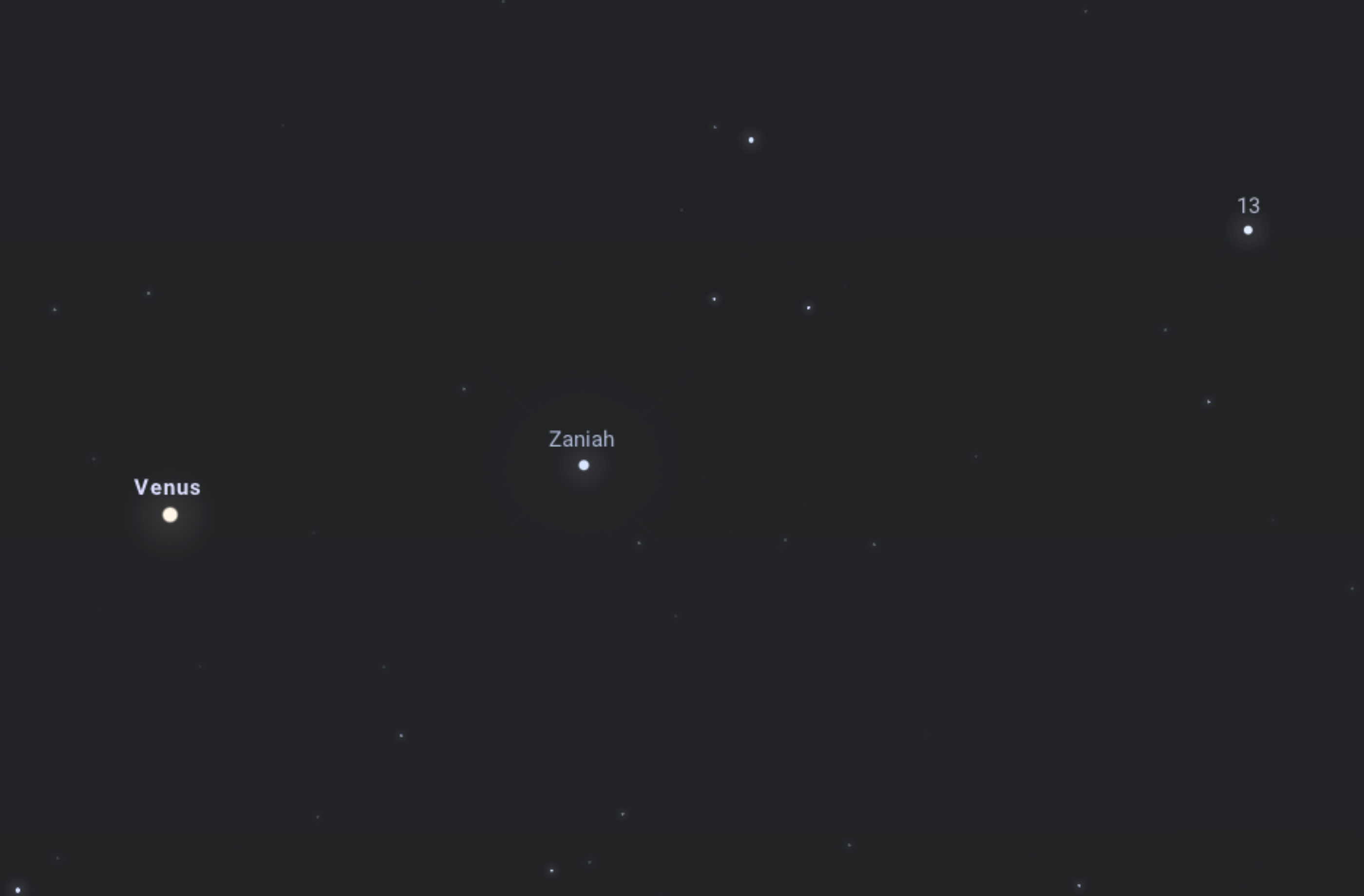 A bolygó és a Zaniah mindössze 12,5’-re lesznek egymástól, ami rendkívül közelinek számít. Egy nagy nagyítású távcső látómezejébe egyszerre látszik a Vénusz korongja és a Zaniah is. Utóbbi kékes színben pompázik majd a bolygó mellett. Egy kézi látcső segítségével a 13 Virginis is megfigyelhető egyszerre a két másik említett objektummal. 18-án reggel 6:00-kor a trió 7°-os horizont feletti magasságban jár. Ezt egyáltalán nem érdemes kihagyni!