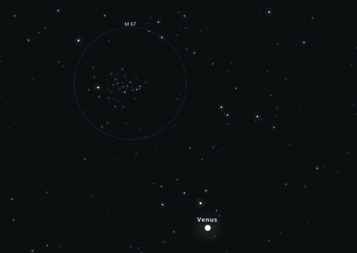 Szeptember 9-én, szombat hajnalban lehet megtekinteni a párost, azonban nem lesz sok időnk az észlelésre. A Vénusz 04:30-kor már 10 fok magasan lesz, és amennyiben tereptárgyaktól mentes a keleti égbolt, már láthatjuk. A legközelebb 04:50-kor lesznek egymáshoz, 48 ívpercre, ami másfélszerese a telihold átmérőjének. A megfigyelést nehezíti, hogy a Hold is világít, az égi háttér fényes lesz tőle. Szabad szemmel csak a Vénuszt lehet látni, ami a legfényesebb lesz a Hold után, -4,40 magnitúdója és 18%-os vékony sarlója lesz. Binokulárral észlelve kivehető lesz a keskeny Vénusz-sarló, továbbá az M67 halvány derengésként fog megjelenni. Távcsövön át nézve, egy 10-15 centis távcsővel már több tucat fényes csillagra bomlik a nyílthalmaz. Az igazán káprázatos élményhez 20 centinél nagyobb átmérőjű távcsőre van szükségünk, ekkor 100 csillagot is megszámlálhatunk. A napfelkelte miatt 5 óra után a Királykobra nyílthalmaz már belevész az égbolt fényébe, így csak az Esthajnalcsillagot észlelhetjük hosszabb ideig.