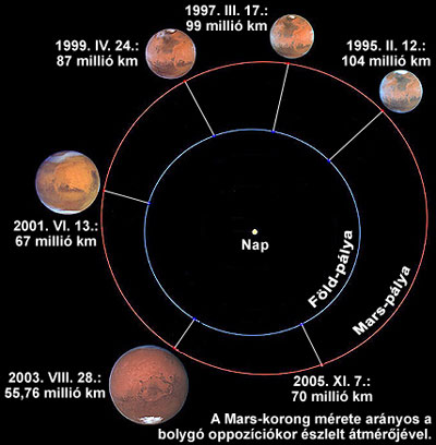Azt is láthatjuk, hogy az egyes oppozíciók során mennyire függ a bolygókorong mérete az aktuális Földtől mért távolságtól!