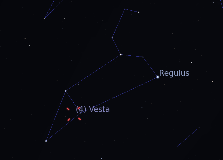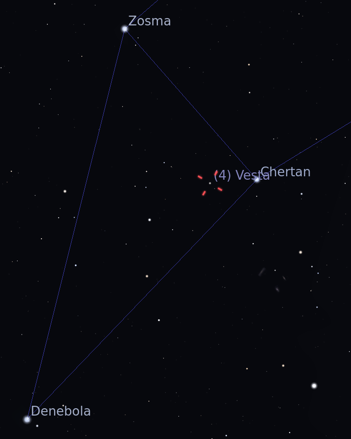 A Vesta oppozícióját idén az Oroszlán hátsó fertályánál éri el, a Chertan nevű Theta Leonis csillagtól 1 fokra északkeletre. Delelésre éppen éjfélkor kerít sort, de mivel ekkor már 60 fok magasan lesz, így akár órákkal korábban is kényelmesen megfigyelhetjük.