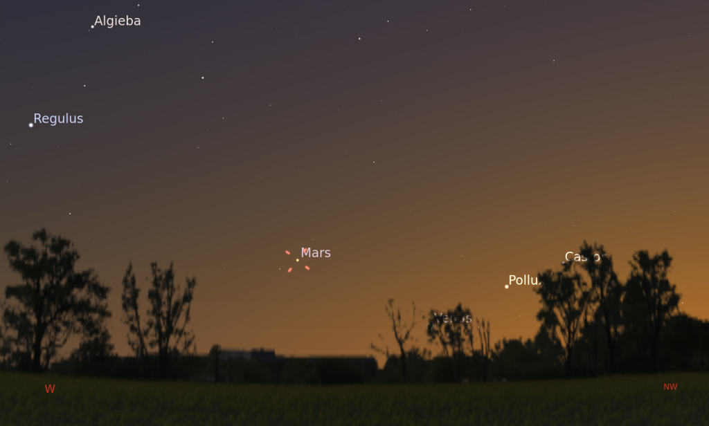 A Praesepe és az együtállás megfigyeléséhez a 22:15 tűnik a legideálisabbnak, ekkor ugyan már csak 5 fokkal lesznek a látóhatár fölött, de az égbolt eddigre kellemesen besötétedik.