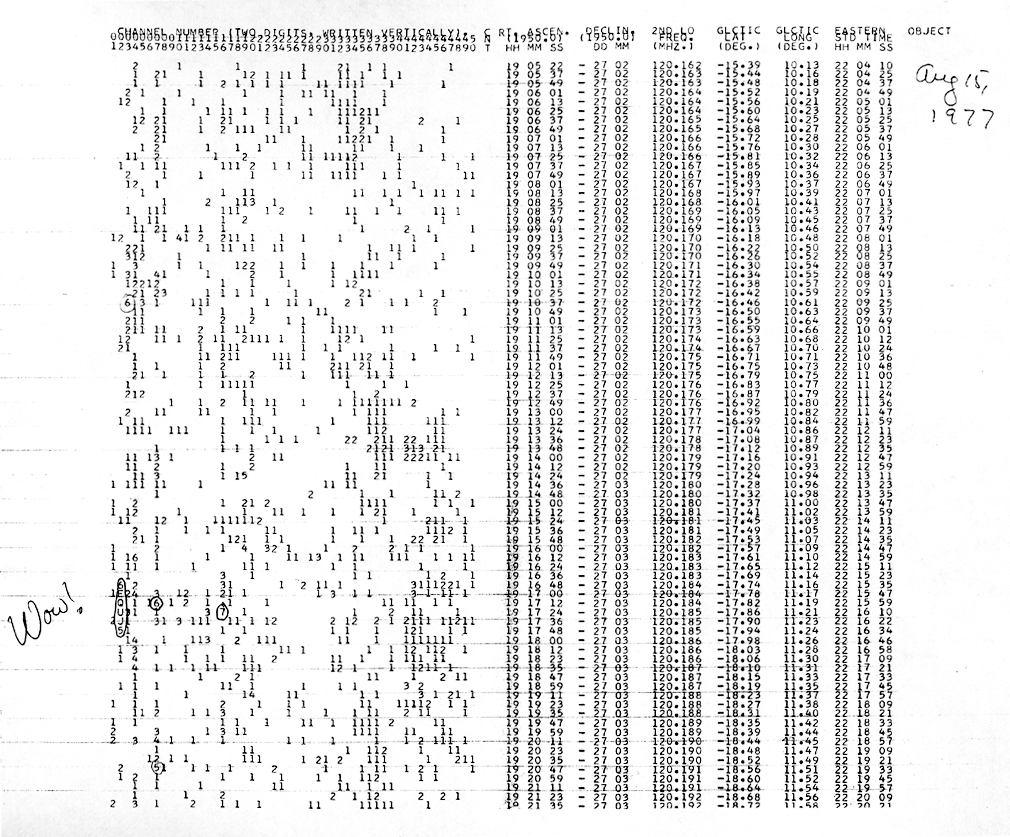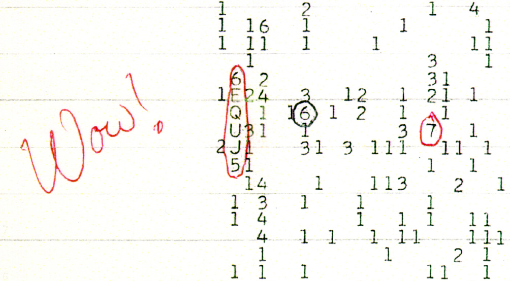 Visszatérve a reggeli kávéhoz, Ehman éppen a néhány nappal korábban, 1977. augusztus 15-én kapott jeleket szemrevételezte, az alacsony intenzitású háttérsugárzástól, azaz a 0 és 1 jelektől elütő, valamilyen különös jelet keresve. És megtalálta! Piros tollával bekarikázta, és mellé írta a Wow! (azaz Hűha!) kifejezést. Ez volt az a karaktersor: 6EQUJ5. Elsőre nem tűnik izgalmasnak. Viszont Ehman tudott olvasni az oszlopok között. Felismerte, hogy egy nagyon nagy intenzitású, keskeny sávú rádiójel-sorozatot fogtak. A jel megismétlődésére számítva még befejezte a papírköteg átvizsgálását (sajnos eredménytelenül), majd értesítette felfedezéséről kollégáit, John Kraust és Bob Dixont.