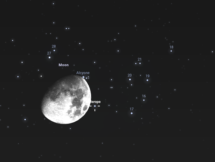 Végül, de nem utolsósorban 03:57-kor a Svábhegyi Csillagvizsgálóból nézve mindösszesen 40 ívmásodpercnyire (a Jupiter bolygó korongjának megfelelő távolságban) halad el a Fiastyúk legfényesebb halmaztagja, a 2,8 magnitúdós Alcyone a Hold fényes felső peremétől. Az ország délnyugatai területein a csillag súroló fedését lehet majd megfigyelni. A Sopron–Ajka–Siófok–Kalocsa vonaltól délre húzódik majd ez a sáv, és csupán két fokkal lesz a horizont felett a Hold ekkor. Emiattt, bár fényes csillagról van szó, az észlelés kifejezetten nehéznek bizonyul majd.