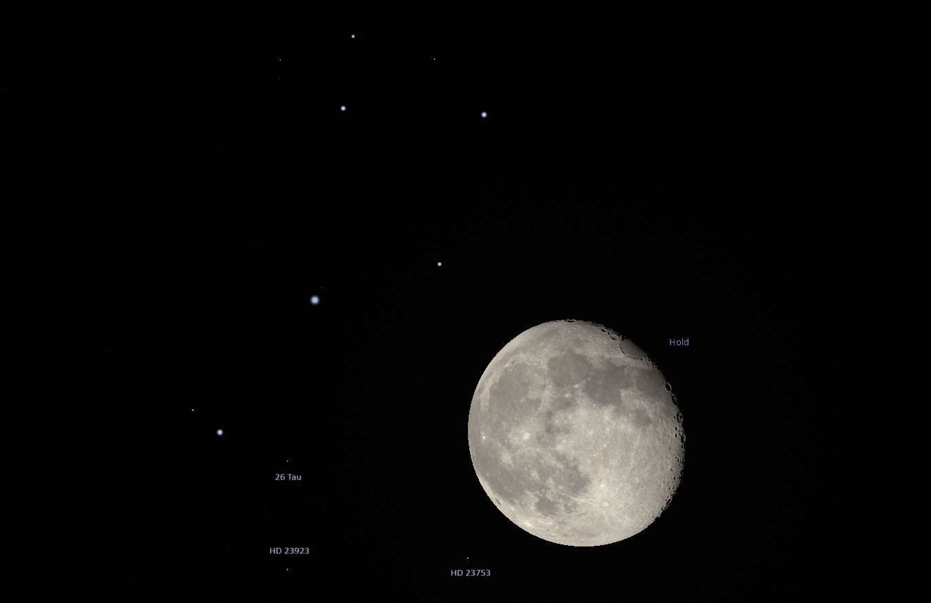 Október 19-én a halmazhoz egy fényes „meglepetés-vendég” csatlakozik, ez pedig nem más, mint égi kísérőnk, a Hold. A Nap körül a bolygók közel egy síkban keringenek, és a Hold pályája a Föld körül is nagyjából ebbe a síkba esik, így azok a csillagok, amik ebben a síkban vagy ettől nem túl messze találhatók, a Földről nézve közel kerülhetnek például Holdunkhoz. Ekkor tudunk fedéseket, együttállásokat megfigyelni. Ezen az estén három fedésnek is a szemtanúi lehetünk a keleti égbolton. A 92%-os fázisú Hold a Fiastyúk peremét 21 óra körül éri el, ekkor a Hold 25 fok magasan lesz az égbolton, és idővel egyre feljebb emelkedik. A halmaztagok belépését a Hold mögé a Hold nagy fényessége miatt nem tudjuk majd megfigyelni, de több halmaztag látványos kibújását a sötét holdperem mögül már igen! Először a HD 23753 csillag kilépését érdemes megfigyelni 22:15-kor a Hold középvonalától kicsit lejjebb, Normál esetben ez a 5,4 magnitúdós fényességű csillag szabadszemes, azonban ekkor a Hold fényessége miatt csak távcsővel próbáljuk meg a kilépést megfigyelni. Ezt követően 22:47-kor a 26 Tau csillag lép ki a Hold mögül, a felső részén. Ezt a kilépést is távcsővel érdemes nyomon követni, ugyanis a csillag magnitúdója 6,5, tehát még sötét, fényszennyezett égbolton is jó szem kellene az észrevételéhez. Végül pedig a 6,2 magnitúdó fényességű HD 23923 jelű csillag lép majd ki az égi kísérőnk mögül 23:05-kor, nagyjából a Hold középvonalán következik be a kilépés.