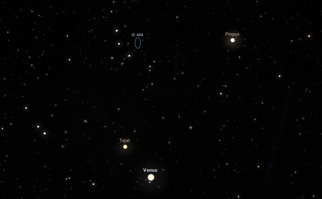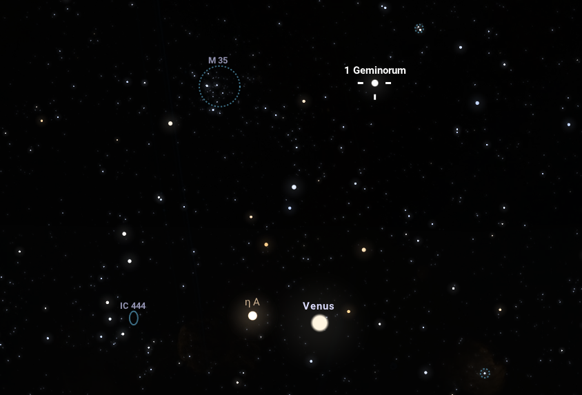 A hónap első napján, pénteken hajnali 3:30-kor a keleti horizont felett 10 fokkal ékeskedik majd az égbolt egyik legfényesebb objektumaként a Vénusz. Nem lesz nehéz tehát megtalálni az Ikrek csillagképben, és arra fordítani távcsövünket, avagy binokulárunkat, hogy észrevehessük az együttállás másik két résztvevőjét: a Vénusztól 1,4 fokra balra fentebb látható, 4,2 magnitúdós látszó fényességű 1 Gem csillagot és az attól még tovább 1,6 fokkal balra található M35-ös számú nyílthalmazt.