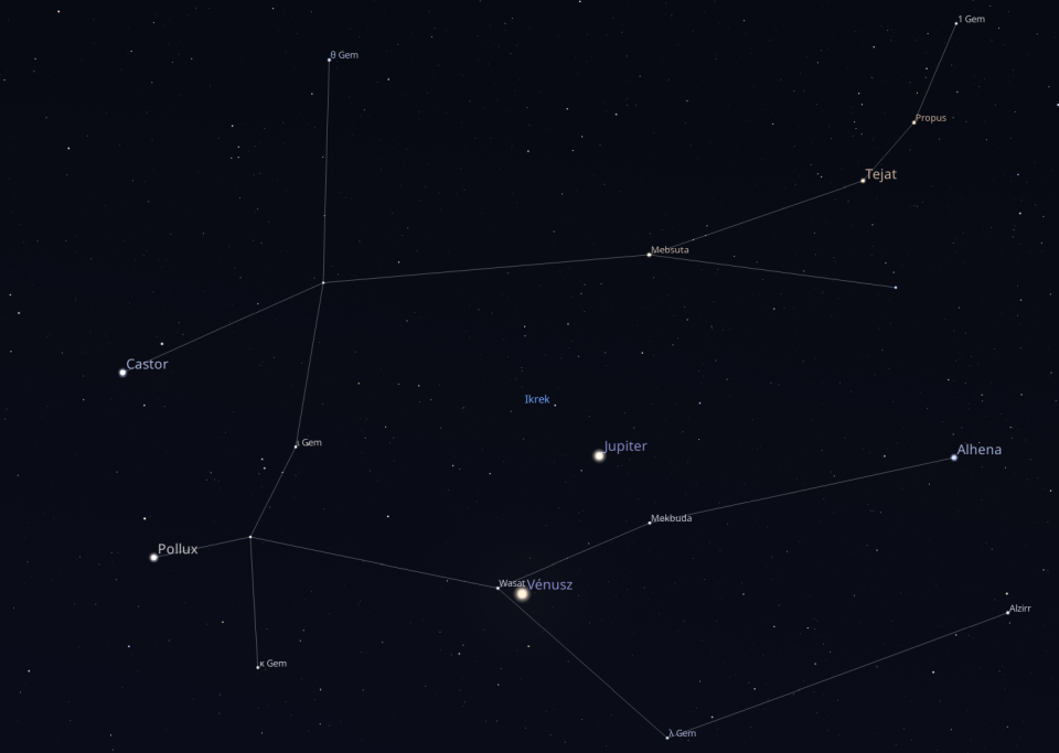 Ezen a bizonyos szombati napon egy szabad szemmel, illetve binokulárral is élvezhető együttállásnak lehetünk tanúi. Hajnali 4:10-kor a bolygó 36'-es közelségbe ér a 3,5 magnitúdós látszó fényességű, delta Gem jelű, Wasat nevű csillaggal, a keleti horizont felett 13 fokkal. Mint ahogy a csillag látszó fényessége is mutatja, az együttállás szabad szemmel is megfigyelhető, de az élmény teljességét egy binokulárral érhetjük el igazán.