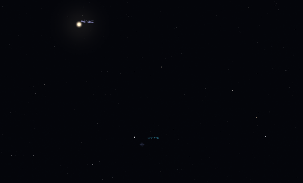 Az utolsó együttállás során a Vénusz az NGC 2392, avagy Caldwell 39 jelölésű planetáris ködhöz kerül közel, amelyet a köznyelvben Eszkimó-köd néven is ismerhetünk. A planetáris ködök kis kezdeti tömegű csillagok körül alakulnak ki, amikor az idősödő csillag lefújja külső burkát. Ezek a külső rétegek táguló, hűlő gázfelhőként a csillag körül néhány 10000 évig megmaradnak, és ilyen módon távcsővel megfigyelhetőek.