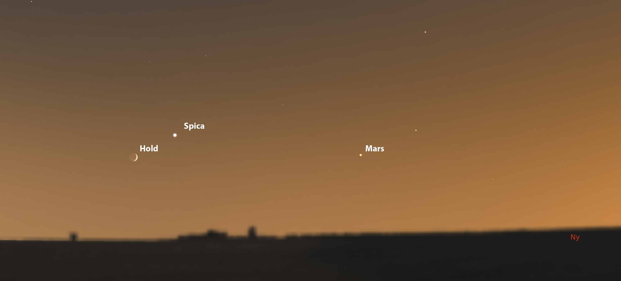 Mars: Naprendszerünk negyedik bolygója már távolodik a Földtől, és hamarosan teljesen belevész a Nap alkonyi fényébe, így ezek a megfigyelési alkalmak is már az utolsók közé sorolhatóak. Binokulárban fényes, narancssárga pötty. Az együttállások megfigyeléséhez ugyan nem lesz szükség távcsőre, akiknél viszont lesz, azok még megpróbálhatják a korongját megfigyelni nagy nagyításokon, de a távolsága és a horizonthoz való közelsége miatt ez nem lesz egyszerű feladat, és a légköri turbulenciák miatt felszíni részletek látványára ne is számítsunk.