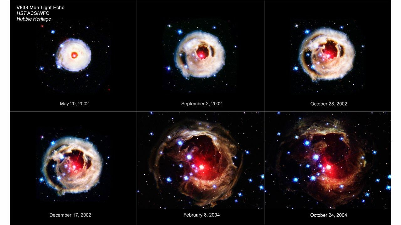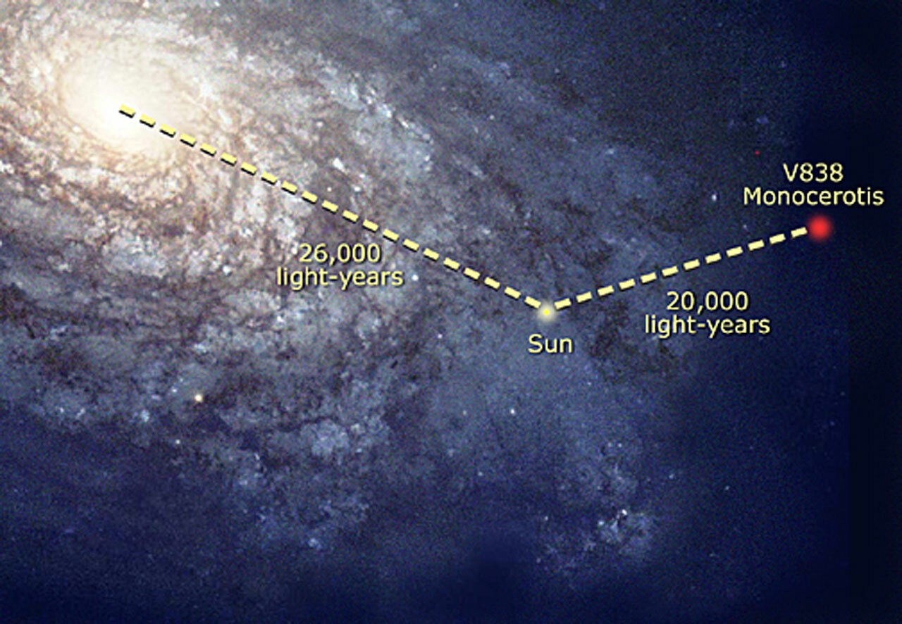 - V838 Monocerotis (Nova Monocerotis 2002): kettőscsillag kb. 19.000 fényévre a Naptól. A korábban jellegtelen csillagot 2002. január 6-án figyelték meg, amikor hirtelen erősen kifényesedett, és változócsillagként a V838 Mon nevet kapta. Aztán úgy gondolták, hogy egy nóvakitörésről van szó, majd a kitöréses változók új osztályának, a nagy luminozitású vörös nóváknak az első tagjaként azonosították. A kitörés oka még mindig bizonytalan, de ma már úgy gondolják, hogy egy hármas rendszeren belül két csillag összeolvadása lehetett. Az olyan gyorsan fényesedő objektumok, mint a nóvák ismertek arról, hogy úgynevezett fényechót produkálnak. Ha a csillag körül csillagközi anyagfelhők vannak, a fény egy része visszaverődik a felhőkről. A hosszabb út miatt a visszavert fény később érkezik meg, és a kifényesedett objektum körül táguló fénygyűrűk jelennek meg. A V838 Mon esetében a keletkezett fényechó példátlan volt, és a Hubble űrteleszkóp ezeket jól dokumentálta.