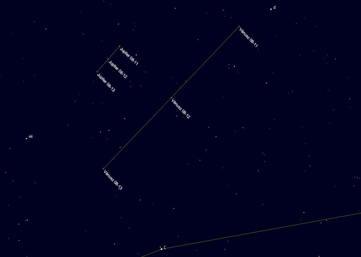 Augusztus 13-án, szerdán hajnalban lesz az utolsó alkalom, hogy megfigyelhetjük szorosan egymás mellett az égi párost. Akik az előző két hajnalban is megtekintették a jelenséget, észrevehették, hogy hétfőn a Vénusz a Jupitertől jobbra és kicsit fentebb helyezkedett el, de szerdán már a gázóriás alatt látható. A jelenség oka, hogy belső bolygószomszédunk sokkal közelebb van a Naphoz, mint a Jupiter, így gyorsabban tesz meg egy teljes fordulatot. Ennek következtében gyorsabban mozog az égbolton, és három nap alatt már jól észrevehető a változás.