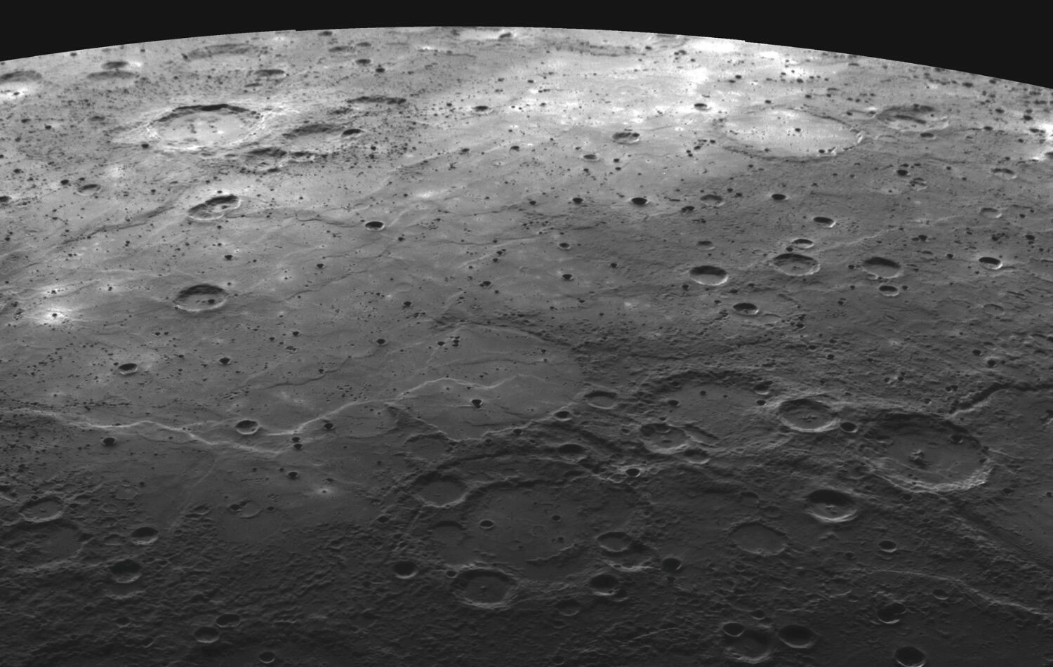 A felszíne nagyon hasonlít az égi kísérőnkéhez, a Holdéhoz, mivel számos kráter és bazalttenger borítja. Az évmilliárdok alatt több aszteroida is eltalálta a piciny bolygót, így létrejött a Caloris-medence, amely a legnagyobb ismert kráter a Merkúron. Mérete igen lenyűgöző, 1550 kilométer, és ezenkívül sok néhány száz kilométer átmérőjű kráter is van az égitest felszínén.