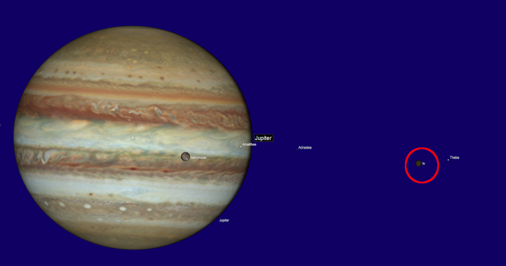 Május 14-én hajnalban, amikor a Nap már 6 fok magasan lesz, a Ganymedes árnyéka fedi el az Iot, azt hasonló mértékben elsötétítve, mint a 6-ai Europa-fogyatkozásnál az Io tette.