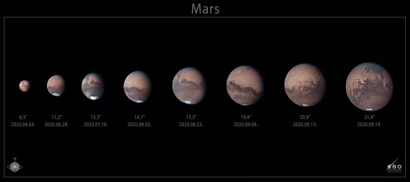 - Így a mostani oppozíció során a Mars még egészen nagy, 22,3”-es átmérőjű lesz, ugyanakkor jó magasan látszik egünkön, beteljesítve a bolygóészlelők minden álmát az ideális láthatósággal kapcsolatban.