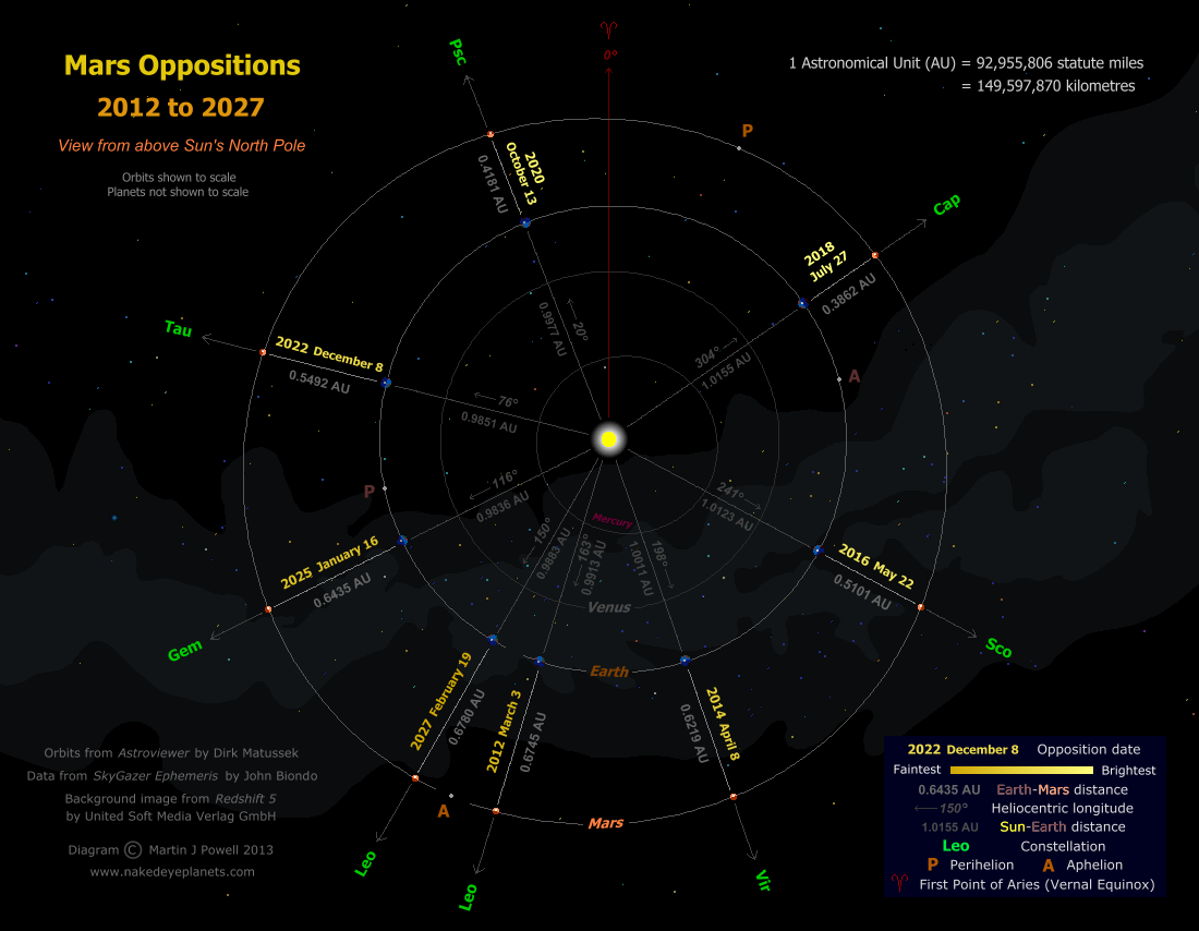 A bolygó oppozícióba október 13-án kerül, azaz ekkor esik a Mars és a Nap a Földdel éppen egy vonalba. A bolygó hozzánk legközelebb azonban egy héttel korábban, október 6-án kerül – ekkor csupán 62 millió kilométerre helyezkedik majd el tőlünk, és legfényesebbnek is ekkor látjuk majd.