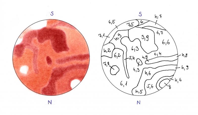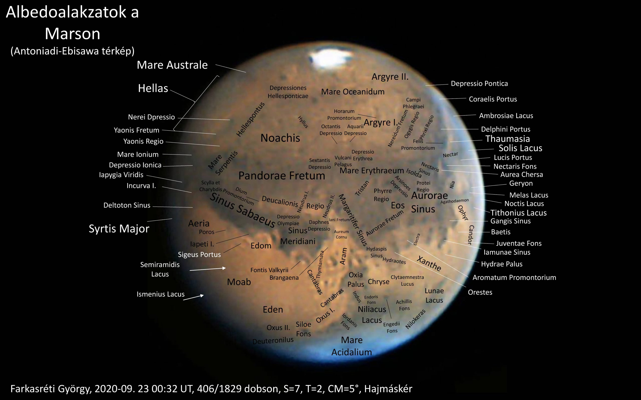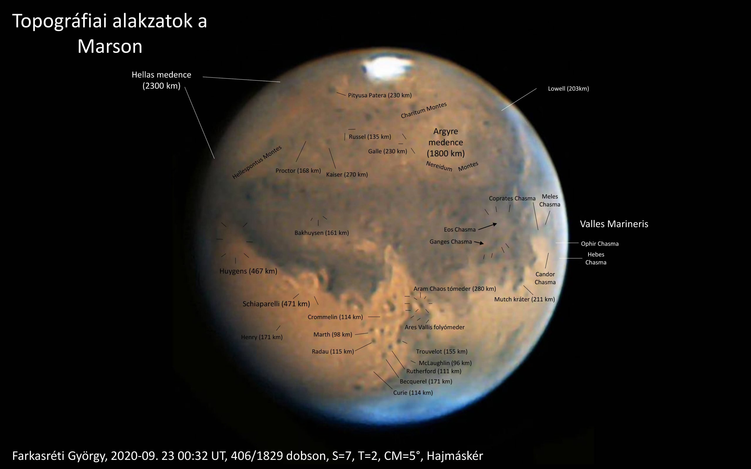 - A Mars két féltekéje határozott kettősséget mutat. Míg az északi félteke (távcsövünkben lent) nagy részét világos terra borítja, amit csak 1-2 határozott mare folt szakít meg, addig a déli féltekén (távcsőben fent) egybefüggő, sötét és kiterjedt mare terület húzódik. A mostani láthatóság során nem kell hát attól félnünk, hogy semmit sem látunk a Marson: bármikor keressük is fel, a felénk billenő déli félteke sötét tengereiből mindig jut elég a bolygóra!