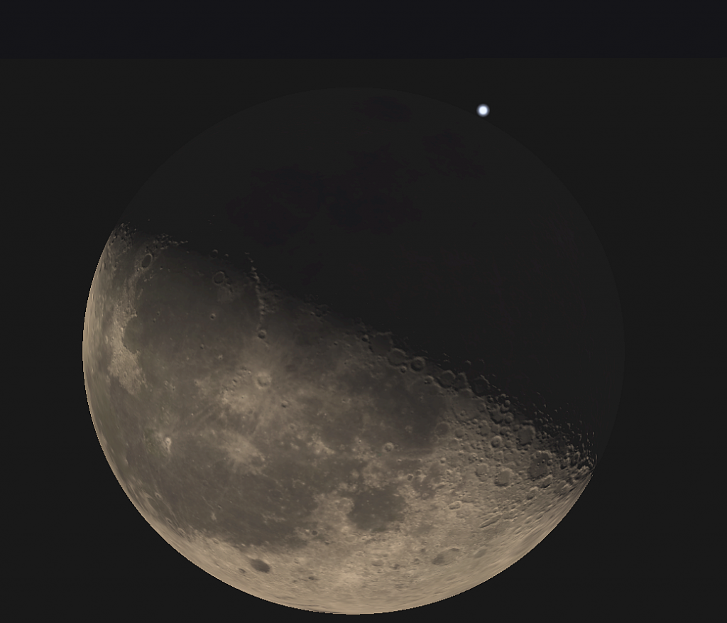 Majdnem egy egész órára (55 percre) takarja el a ragyogó csillagot. Kis távcsővel, vagy binokulárral megfigyelve a terminátor - a Hold sötét és világos területét elválasztó sáv – közelében, sötét mare területek által közrefogva láthatjuk a Copernicus krátert, melyből gyönyörű, sugár irányban kiinduló fehér sávok őrzik az elemi erejű becsapódás emlékét.