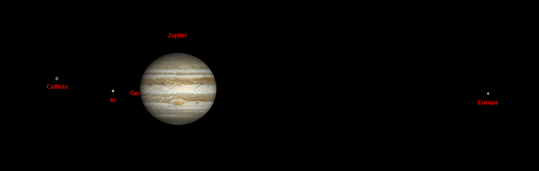 A négy Galilei-hold, az Io, Europa, Ganymedes és Callisto folyamatosan egy síkban keringenek a Jupiter körül. Távcsővel szemlélve a Jupiter jobb és bal oldalán, egy egyeneses mentén mozognak a holdak, közeledve vagy távolodva a bolygótól.