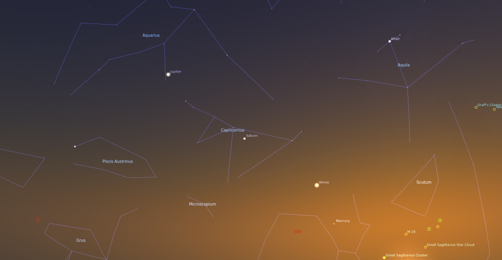 16:30 Merkúr-Vénusz-Szaturnusz-Jupiter együttállásKarácsony első ünnepén napnyugta után 16:30-kor gyönyörű együttállásnak lehetünk tanúi. Négy bolygó sorakozik katonásan a délnyugati horizont felett. Az Első a Merkúr, mely a Napot követve épp lenyugszik a láthatáron. Következő a Vénusz, ami -4.6 magnitúdójával az égbolt jelenleg legfényesebb objektuma, káprázatosan ragyog. De sietnünk kell, öt után már nagyon alacsonyan jár, hamarosan ő is eltűnik. Harmadikként a Szaturnusz következik, a leghalványabb bolygó a négy közül, eltéveszteni mégsem lehet, mivel épp az előző és a következő égitest, a Vénusz és a Jupiter között találjuk félúton. A sort a bolygók királya, a fényesen tündöklő Jupiter zárja.